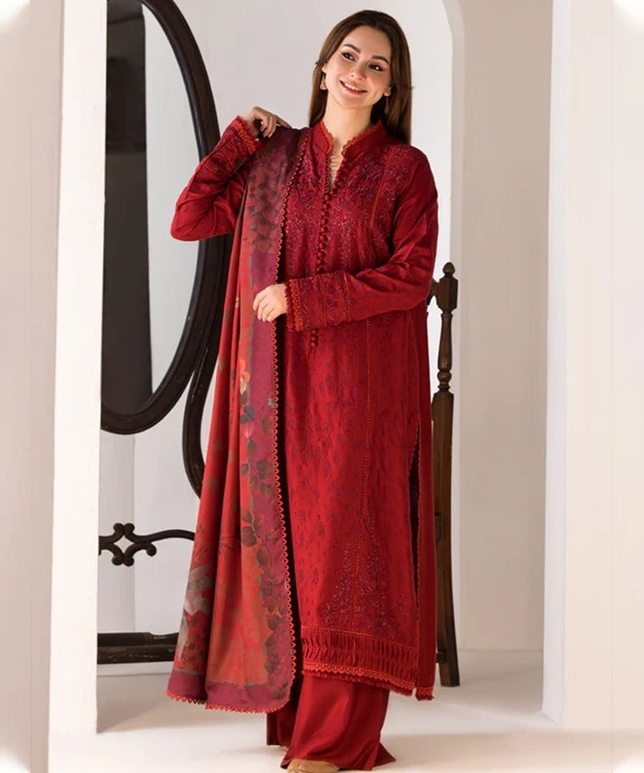 Shirt: Embroidered (Front & Sleeves) with Dyed Plane (Back) with Organza Embroidered Daman Patches. Dupatta: Printed Wool Shawl Trouser: Plane Dyed
